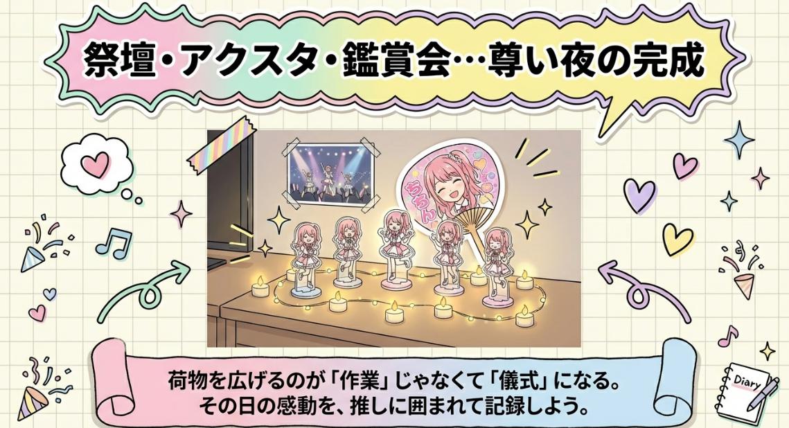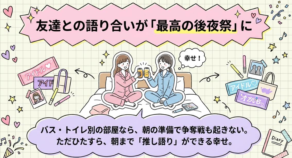 ライブが終わった後の、あの高揚感が冷めやらない夜を、無機質なビジネスホテルで終わらせていいんでしょうか?推しのぬいぐるみやアクスタをキャリーの底から引っ張り出して、狭いベッドの端っこに置いて、それで終わり?