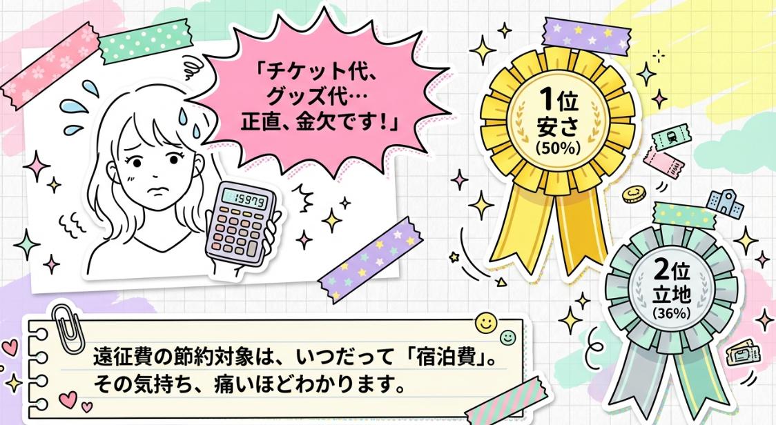 グッズ代、円盤代、雑誌代、現場ごとに積み重なる出費のなかで、宿泊費は「唯一自分でコントロールできるコスト」として節約対象になっていく。それは当然の話です。交通費抑えるために夜間のバスを探してる女子も多いです。