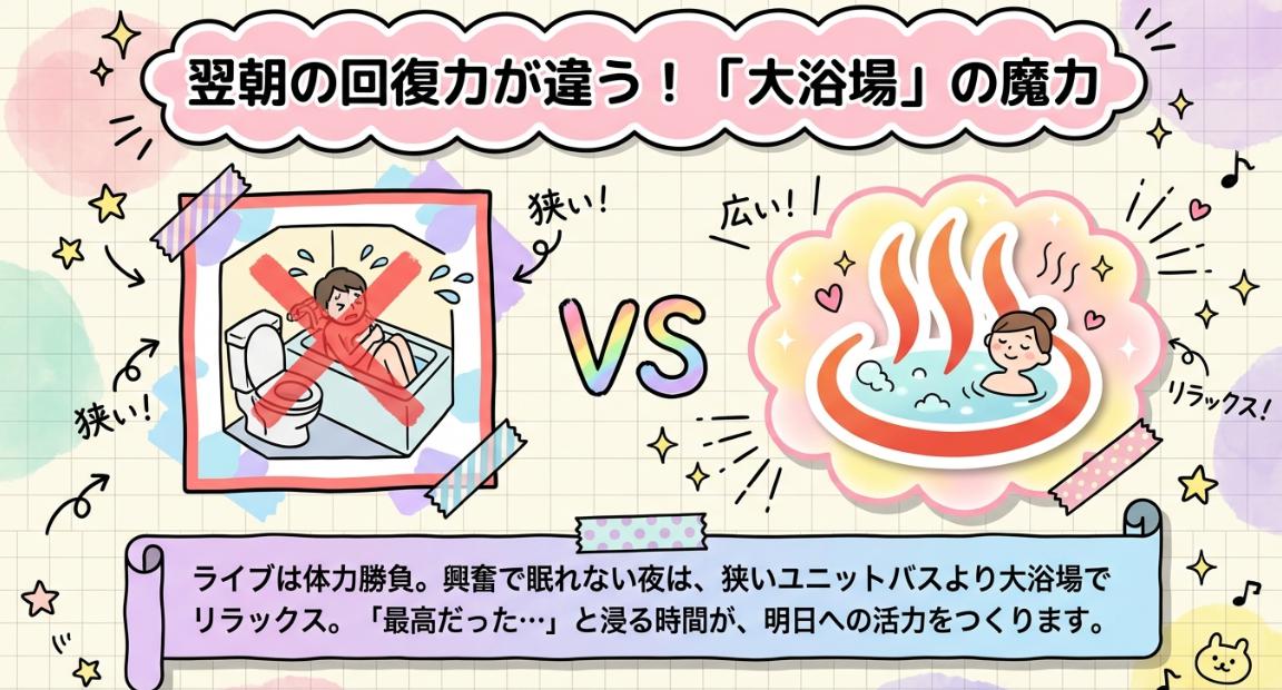 複数人での遠征なら、仲間と推し語りしながら大浴場でゆっくりするのも最高の"後夜祭"になりますよ。