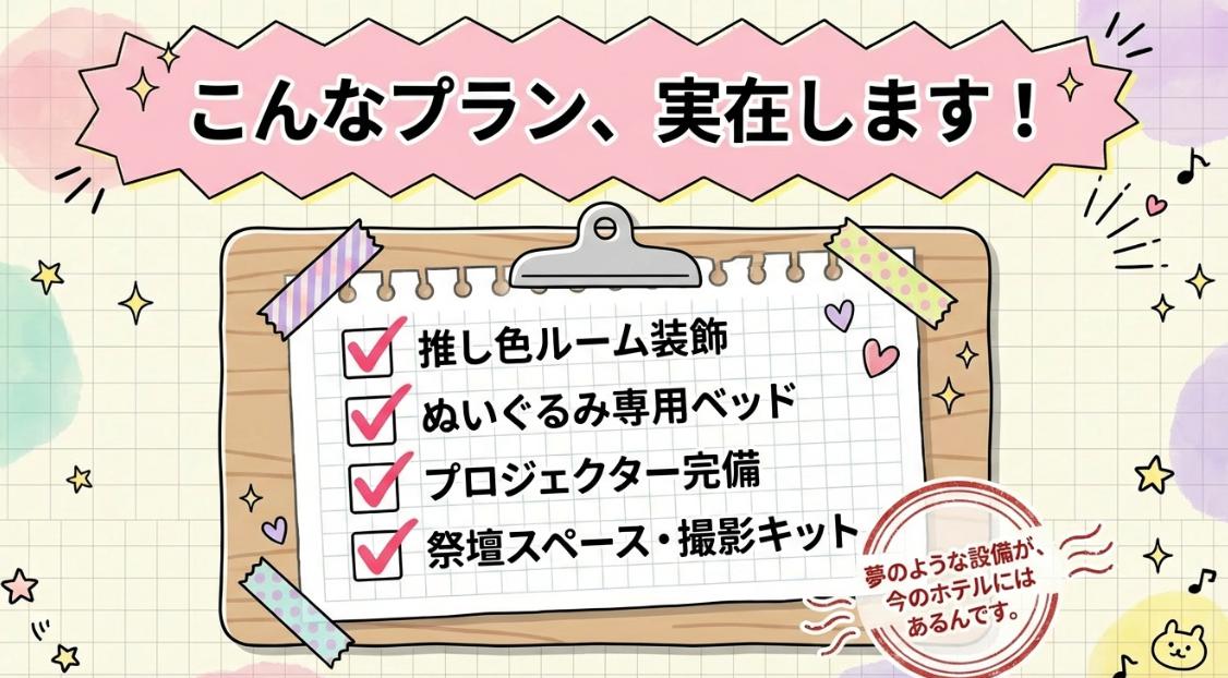推し色に染まった空間・ぬいぐるみ専用ベッド・祭壇が組める設備など、推し活層のニーズに応えたプランを厳選。遠征エリア別に確認できます。